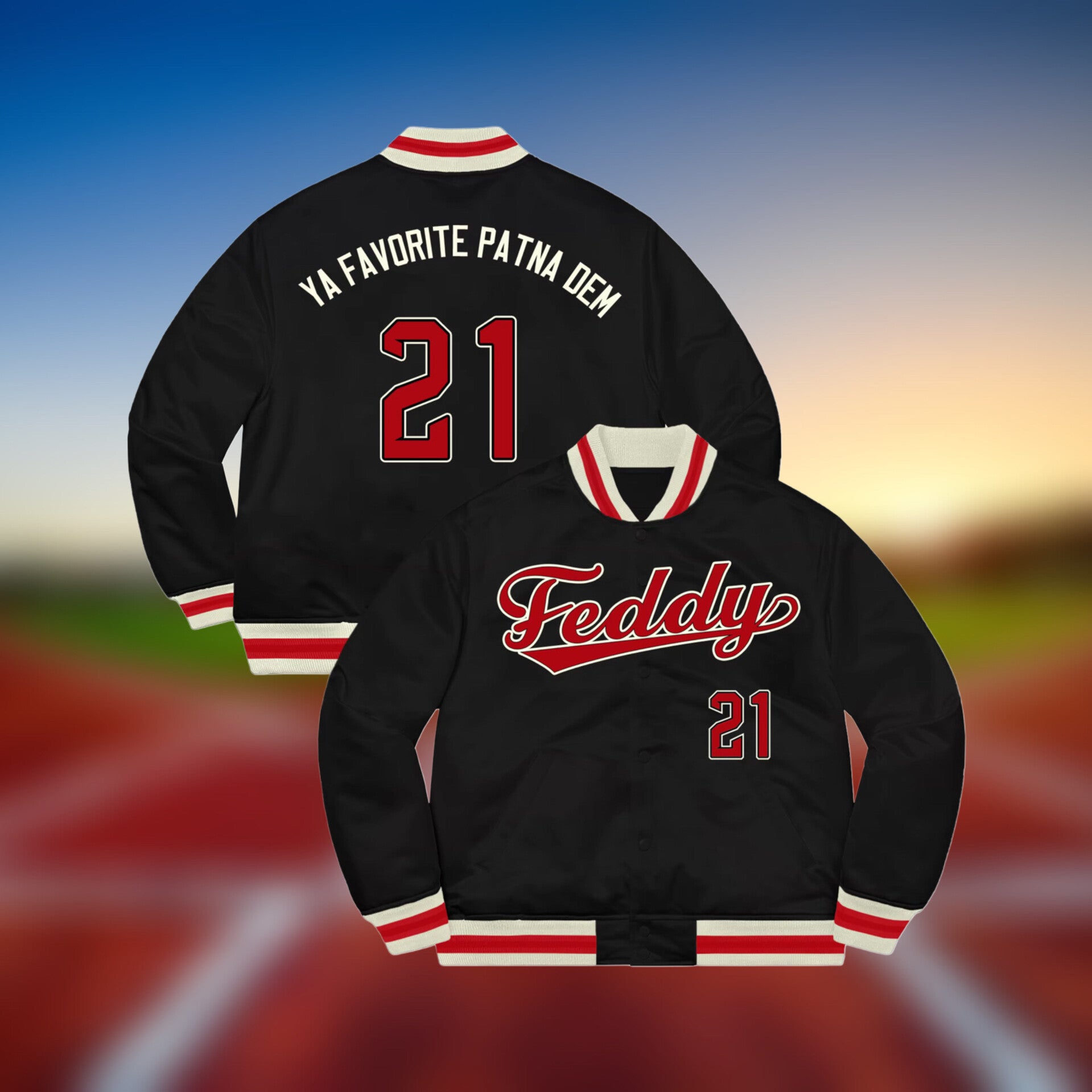 Varsity Baseball jacket. Black, red, and tan. Style combination with The Feddy Chaser Cap
